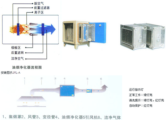 JYL系列油煙凈化器為二級式靜電吸附型,用來去除細微粒徑的碳氫化合物和其它空氣中的雜粒。它的二級式是指電離段與收集段,每個電離段由一系列鎢鋼線組成,安裝在一系列接地板中間,并通過高壓直流電。大氣中的微粒在通過電離器的強力靜電場時,被電離并帶有正或負電荷。每個收集段由很多數量的平行板組成,通以高壓直流電 (極性與電離器一致,但電壓減半)以形成電場,帶電微粒被接地板吸引的同時也受到帶電板的驅趕。因此,當氣流中含有帶電微粒時,可以被高效去除。 |