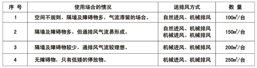 所需誘導風機的臺數,在考慮通風方式(機械送排風,自然進風機械排風),有無隔墻,空間形狀的前提下,按每臺誘導風機所要承擔的面積計算,可參照下表確定: