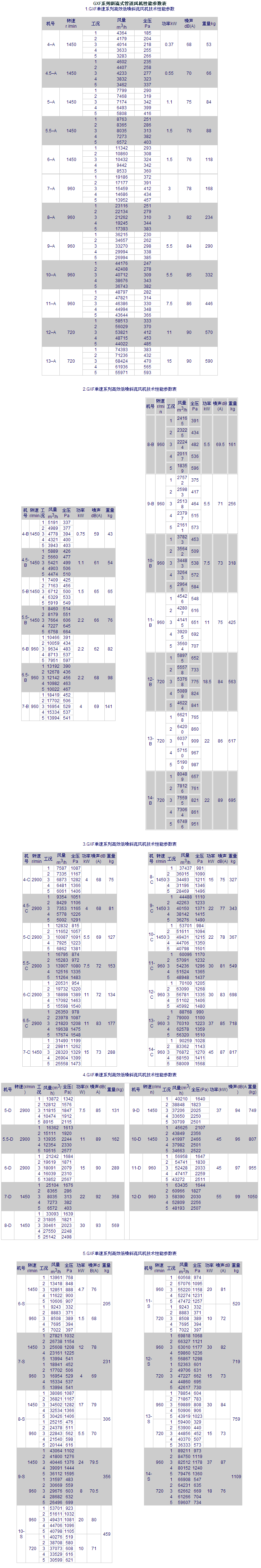GXF系列斜流式管道風機性能參數表 1.GXF單速系列高效低噪斜流風機技術性能參數