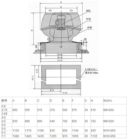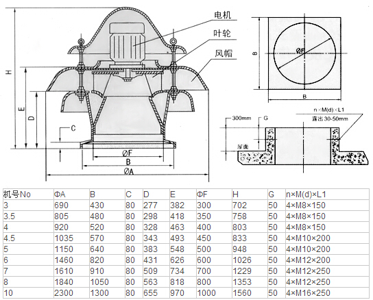 2.DWT-II型離心式屋頂風機外形結構圖及安裝尺寸