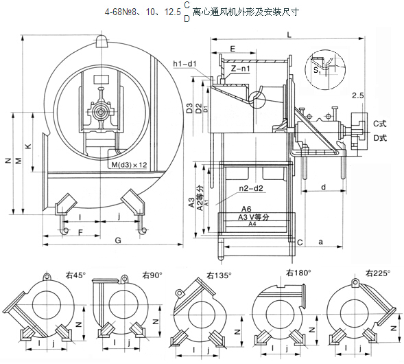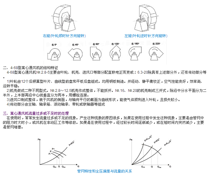 4-68型離心通風(fēng)機(jī)可制成右旋轉(zhuǎn)和左旋轉(zhuǎn)兩種型式。從電動(dòng)機(jī)一側(cè)正視。葉輪順時(shí)針旋轉(zhuǎn),稱為右旋風(fēng)機(jī),以“右”表示;葉輪逆時(shí)針旋轉(zhuǎn),稱為左旋風(fēng)機(jī),以“左”表示。風(fēng)機(jī)的出口位置.以機(jī)殼的出風(fēng)口角度表示。